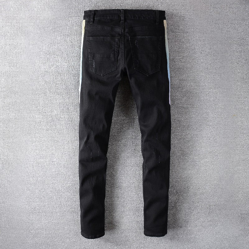 White Line Decorated Plain Ripped Jeans with Denim Material, Stripe Fabric Type, Zipper Fly Closure Type, and Slim Fit Type