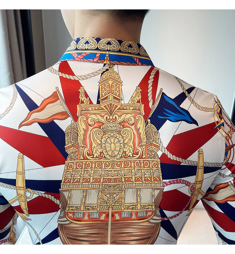 Keep your style in check with this versatile men's shirt. Fashioned with a subtle turndown collar and long-sleeves, this shirt is stylish and modern. The palace print gives it a retro-mod look that will update your casual wear. Pair it with a variety of looks to add a unique twist to every outfit.