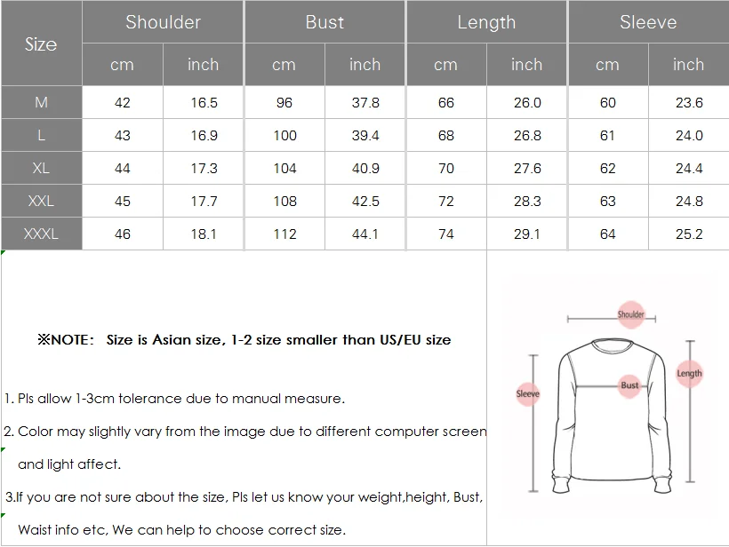 Ex: If you wear S on US Size, it is better if You Choose L on the Asian Size.