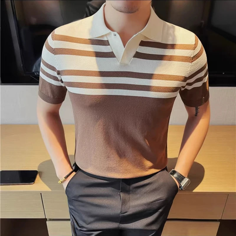 Knitted Vertical Striped Short Sleeved Polo Shirt